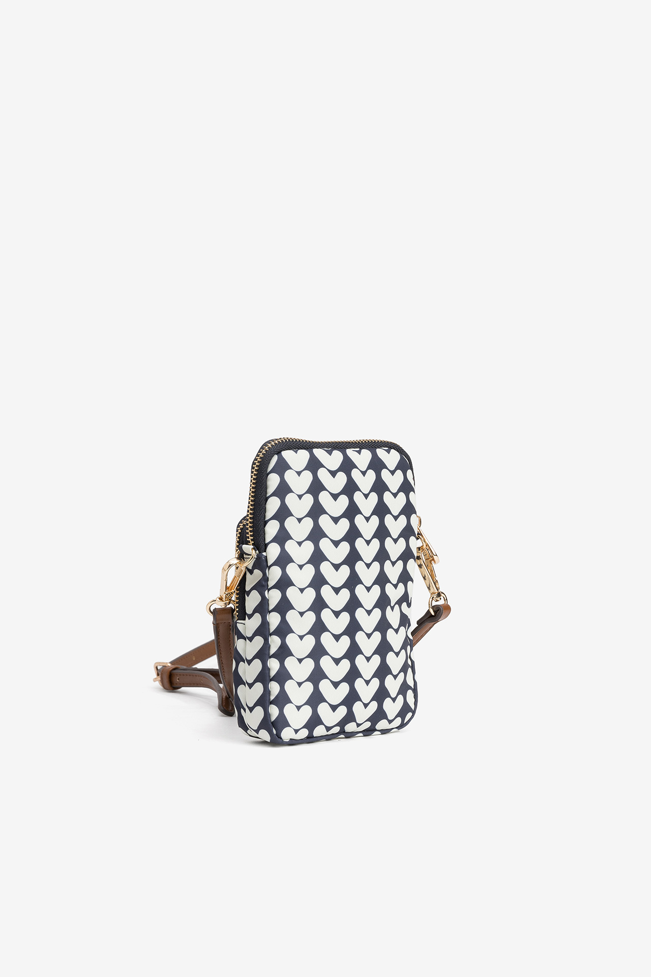Porta monedas azul marino oscuro con estampado de corazones blancos y cierre de cremallera dorado.